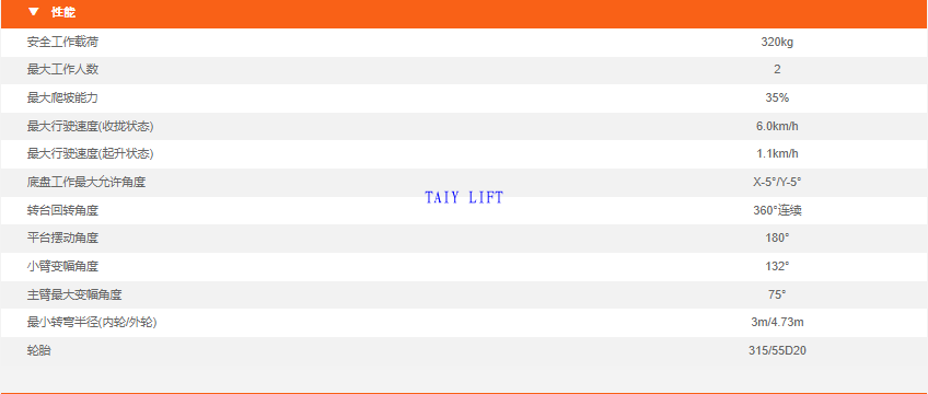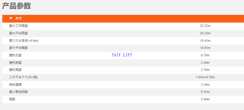 最大工作高度:22.22米 最大作業(yè)幅度:15.41米 安全載荷重量:320KG 設(shè)備自重:9600KG 動力源:48V鋰電池